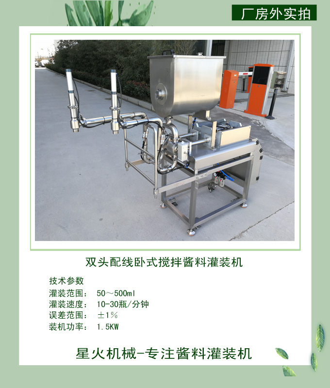 雙頭配線臥式攪拌醬料灌裝機(jī)主要是針對粘稠并帶有顆粒且濃度較大的醬狀物料灌裝而設(shè)計的,如蘑菇醬、火鍋底料、香菇醬、豆瓣醬、鮮辣醬等灌裝的臥式攪拌醬料灌裝機(jī),臥式攪拌,確保醬和油的充分混合,灌裝物料更均勻,結(jié)構(gòu)簡單、精確度高、操作簡便。