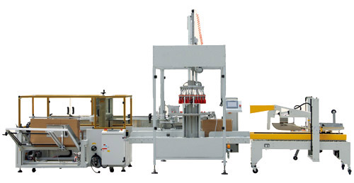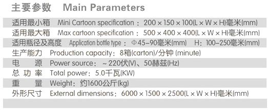配套瓶裝生產(chǎn)線的后道全自動裝箱生產(chǎn)。同時擁有多項國家技術專利,整機性能可靠,產(chǎn)能高,包裝效果美觀。